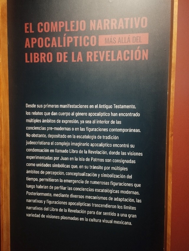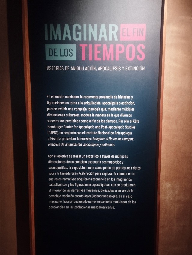 Fue una exposición temporal que traza un itinerario a partir de los relatos sobre la llamada Gran Aceleración, como advenimiento de un eventual sexto episodio de extinción masiva, así como sus correlatos en los imaginarios y las figuraciones apocalípticas que se produjeron en el terreno de las cosmologías modernas, y sus posibles vínculos con el complejo narrativo generado por la tradición escatológica judeocristiana que, en el caso mexicano, habría funcionado también como herramienta para modular los mecanismos categorización mesoamericanos, articuladores de las cosmologías y visiones que lo grupos humanos, presentes entonces en el territorio mexicano, tenían sobre sucesos o potenciales eventos que pondrían fin al mundo.